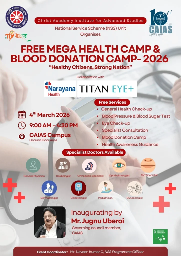 Organised by the National Service Scheme (NSS) Unit of Christ Academy Institute for Advanced Studies, in collaboration with Narayana Health and Titan Eye+.