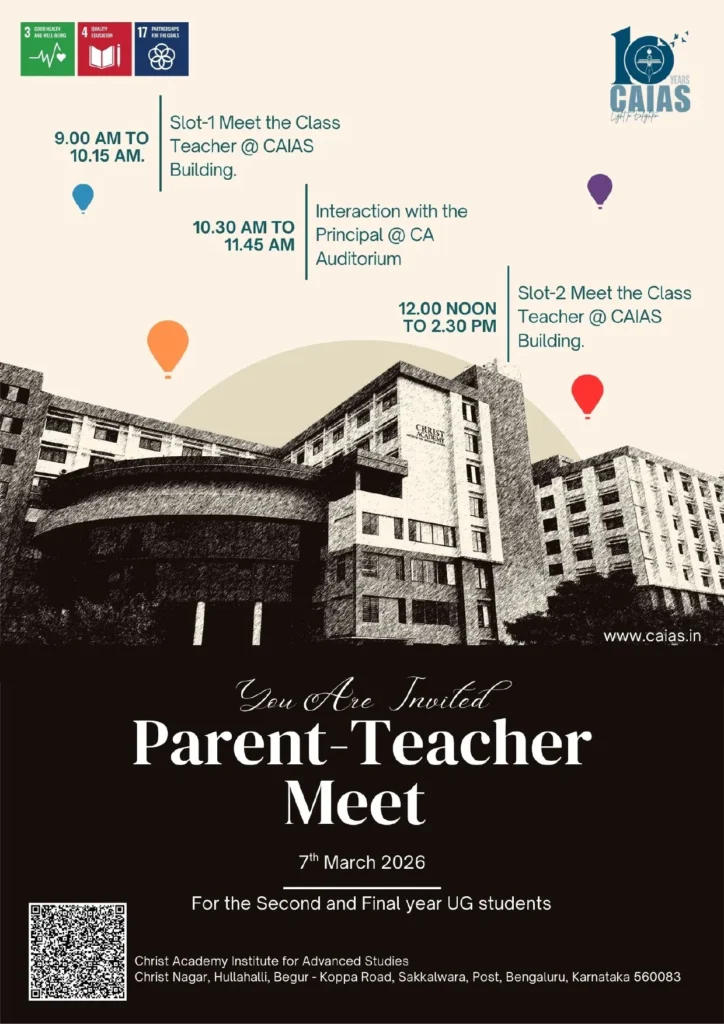 You are cordially invited to the Parent-Teacher Meet at Christ Academy Institute for Advanced Studies. This meeting is scheduled for the Second and Final year UG students.