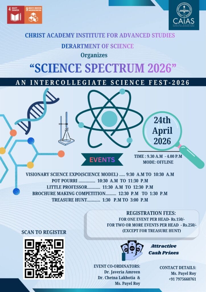 Organised by the Department of Science, Christ Academy Institute for Advanced Studies. A dynamic platform celebrating curiosity and innovation through competitions like Visionary Science Expo, Pot Pourri, Little Professor, and Treasure Hunt in the fields of Physics, Mathematics, and Psychology.