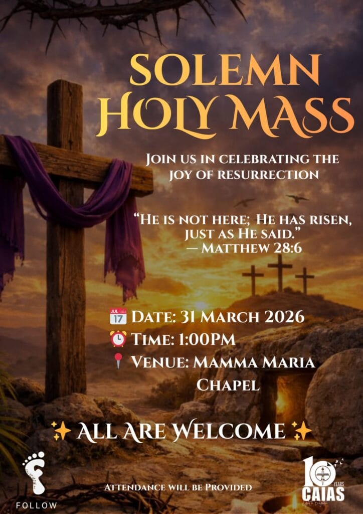 Organised by CAIAS. A spiritual gathering to observe the Solemn Holy Mass with the theme “He is not here; He has risen, just as He said” (Matthew 28:6).