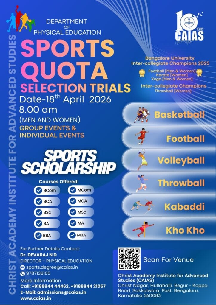 Organised by the Department of Physical Education, Christ Academy Institute for Advanced Studies. Selection trials for group and individual events including Basketball, Football, Volleyball, Throwball, Kabaddi, and Kho Kho. Scholarships available for various UG and PG courses.