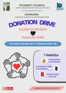 DONATION DRIVE HANDS TO HEARTS: PAGES OF HOPE Organised by the Student Council, Christ Academy Institute for Advanced Studies. In