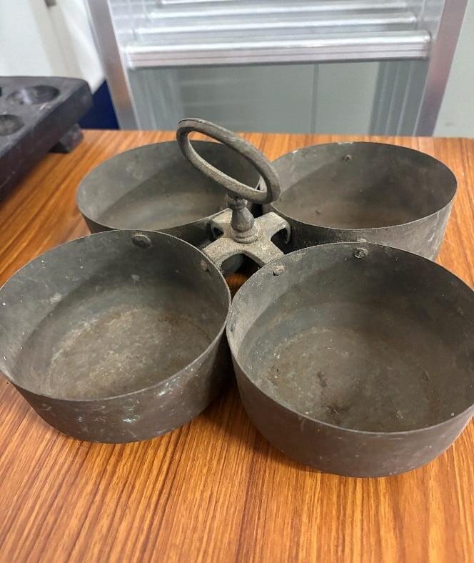 The Tinisu Patre (ತಿನಿಸಿನ ಪಾತ್ರೆ) is a charming and practical serving vessel that exemplifies the communal dining culture of traditional South Indian homes. Often confused with a spice box, this multi-bowl carrier is specifically designed for serving accompaniments rather than long-term storage. Typically crafted from Brass (Hittale) or Bronze (Kanchu), it features four deep, symmetrical bowls riveted to a central frame and topped with a sturdy ring handle. The beautiful dark patina and hints of green oxidation seen on antique pieces are marks of authentic metal and decades of use at the family dining table, where it was used to carry multiple condiments in a single trip.