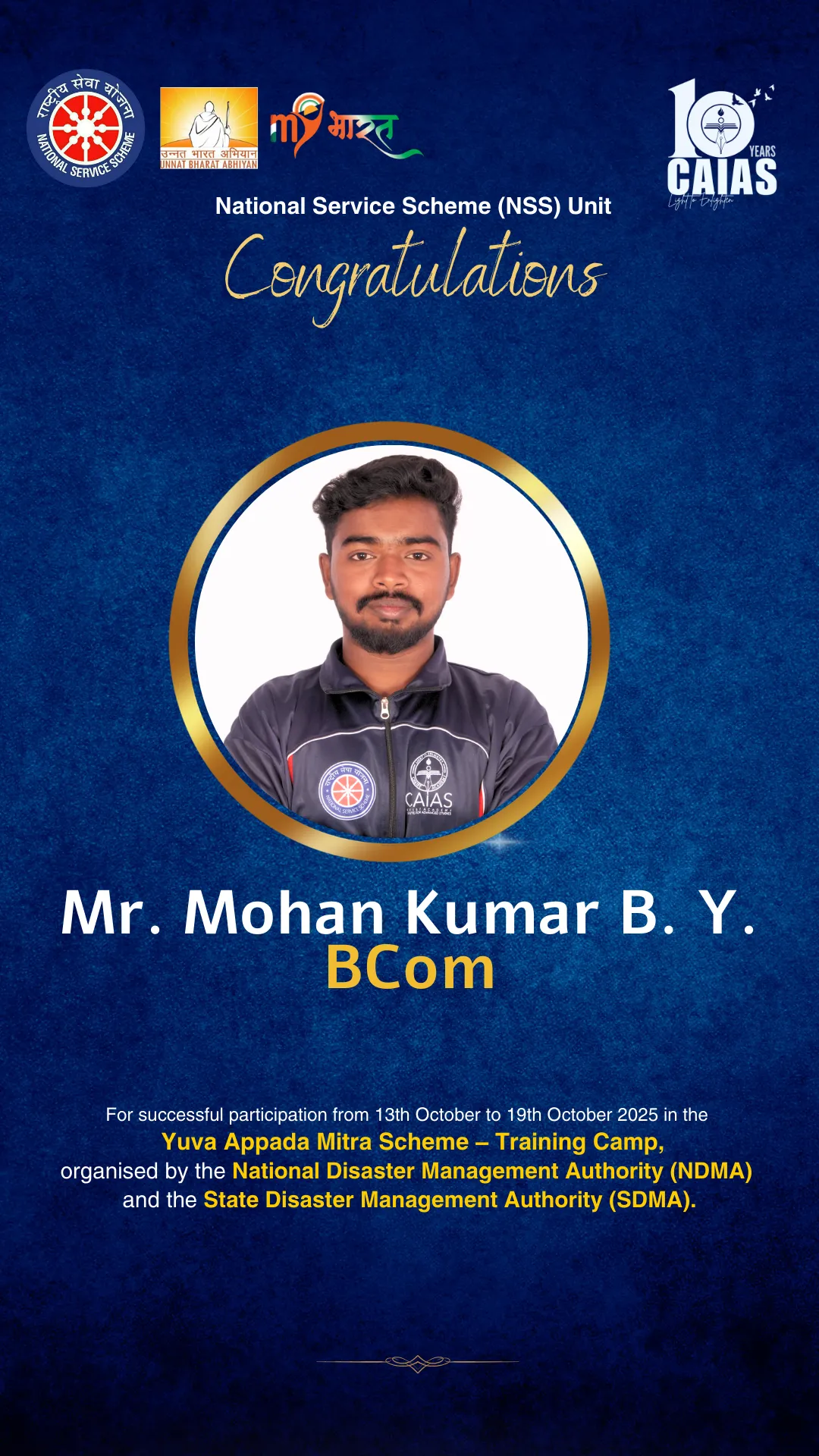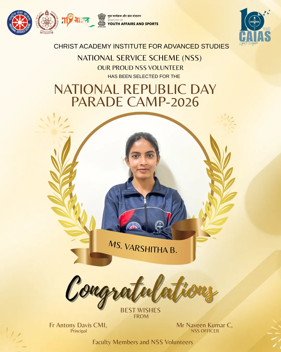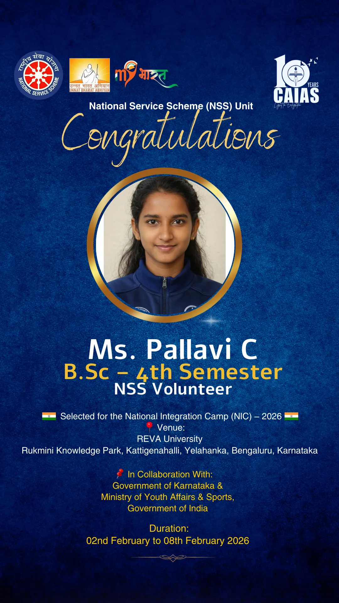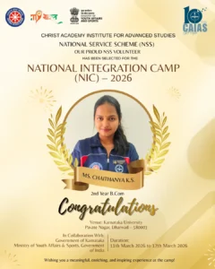 The motto or watch word of the National Service Scheme is ‘NOT ME BUT YOU’. This reflects the essence of democratic living and upholds the need for selfless service and appreciation of the other person’s point of view and also to show consideration for fellow human beings. It underlines that the welfare of an individual is ultimately dependent on the welfare of society as a whole. Therefore, it should be the aim of the NSS to demonstrate this motto in its day-to-day program.